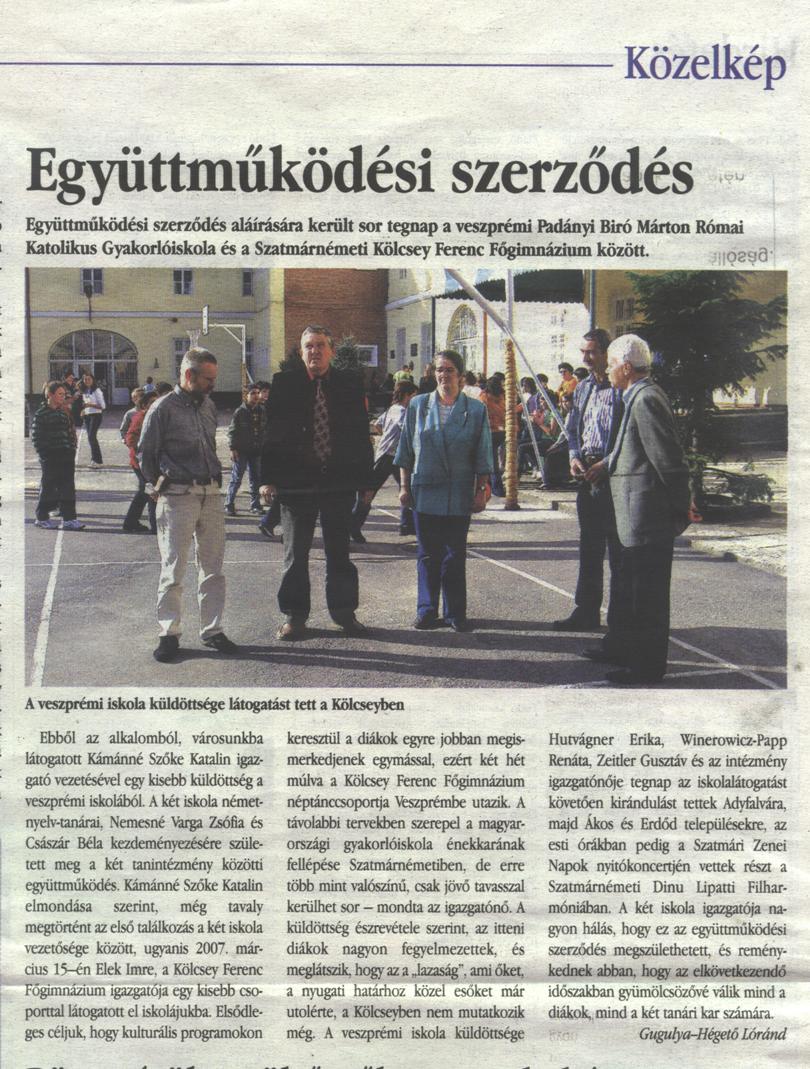 Kámánné Szőke Katalin elmondása szerint, még tavaly megtörtént az első találkozás a két iskola vezetősége között, ugyanis 2007. március 15én Elek Imre, a Kölcsey Ferenc Főgimnázium igazgatója egy kisebb csoporttal látogatott el iskolájukba. Elsődleges céljuk, hogy kulturális programokon keresztül a diákok egyre jobban megismerkedjenek egymással, ezért két hét múlva a Kölcsey Ferenc Főgimnázium néptánccsoportja Veszprémbe utazik. A távolabbi tervekben szerepel a magyarországi gyakorlóiskola énekkarának fellépése Szatmárnémetiben, de erre több mint valószínű, csak jövő tavasszal kerülhet sor mondta az igazgatónő.