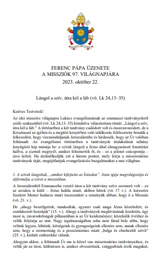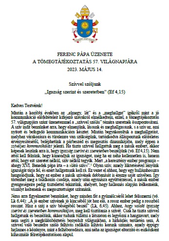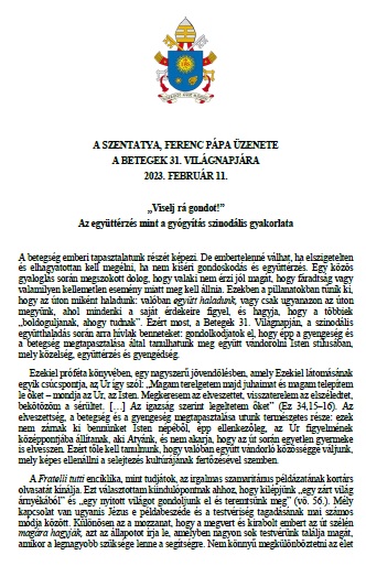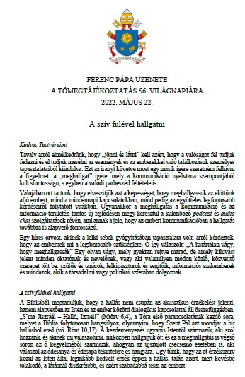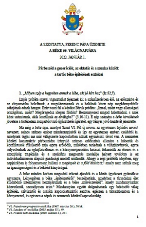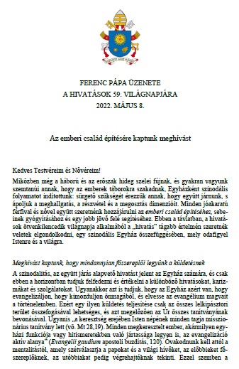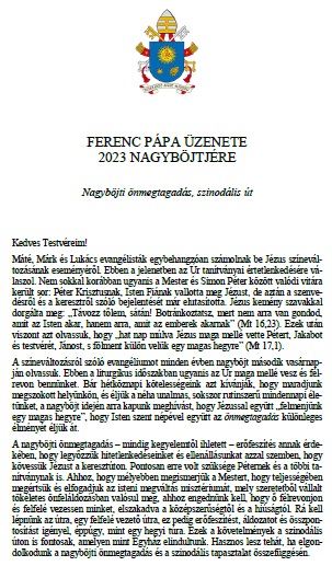 A Szentatya, Ferenc pápa 2022. február 23-án az általános kihallgatás végén arra kért mindenkit, hogy március 2-án, hamvazószerdán tartsunk böjti napot a békéért. Külön biztatta a hívőket, hogy azon a napon buzgón szenteljék magukat az imádságnak és a böjtnek, kérve Szűz Máriának, a Béke Királynőjének közbenjárását. A Püspöki Konferencia körlevelében megfogalmazott szándékok mellett - magyar hazánkért és népünkért - , idei hamvazószerdai böjtölésünket, imáinkat és jócselekedeteinket a Szentatya szándéka szerint a béke megőrzéséért is ajánljuk majd fel!