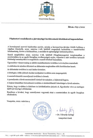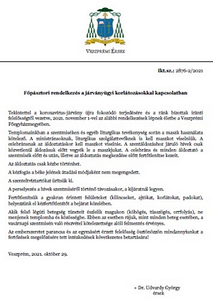 Dr. Udvardy György érsek úr főpásztori rendelkezése a járványügyi korlátozásokkal kapcsolatban (2021.10.29.)
