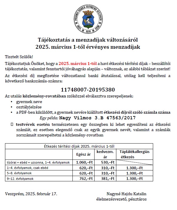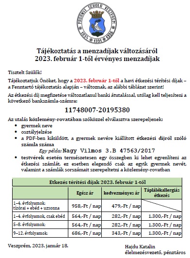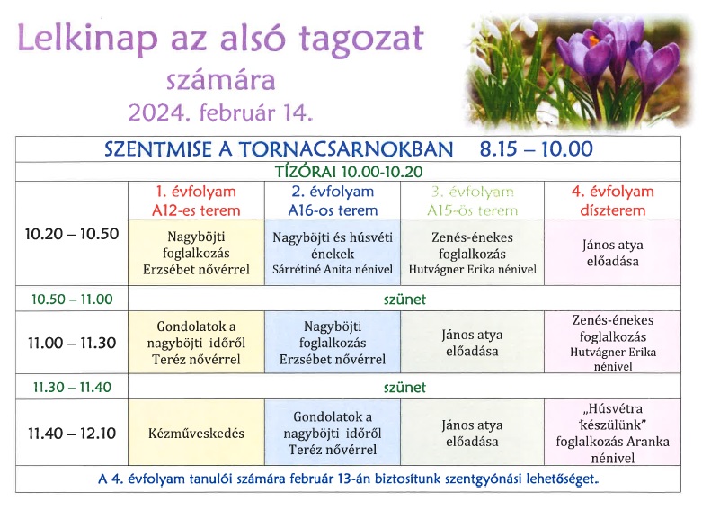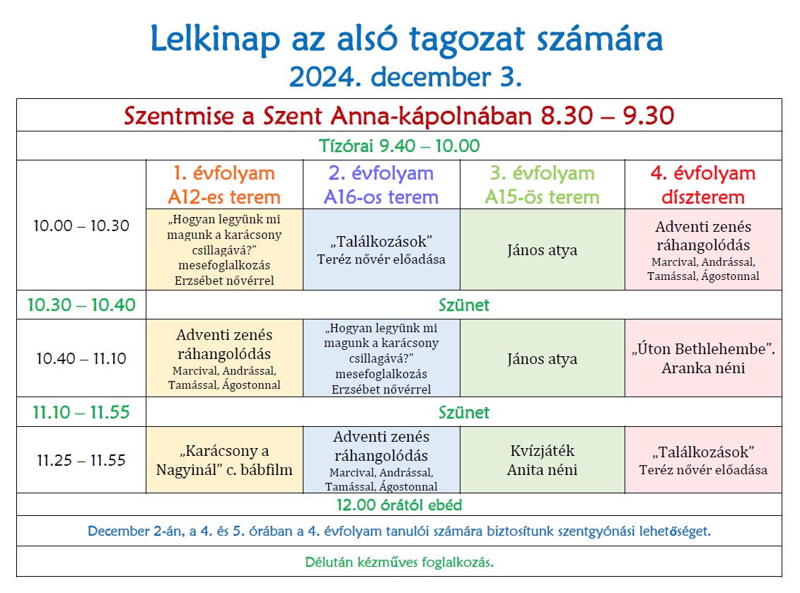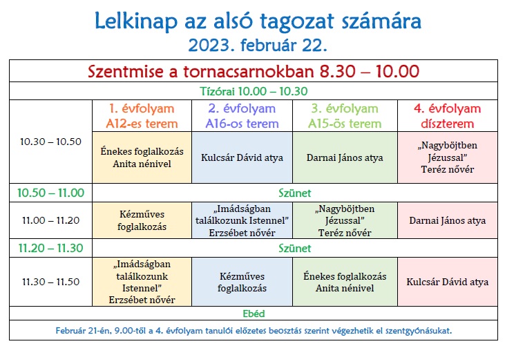 9-13. évfolyamokon az első 5 tanóra hittan/osztályfőnöki, menzások ezután ebédelhetnek.