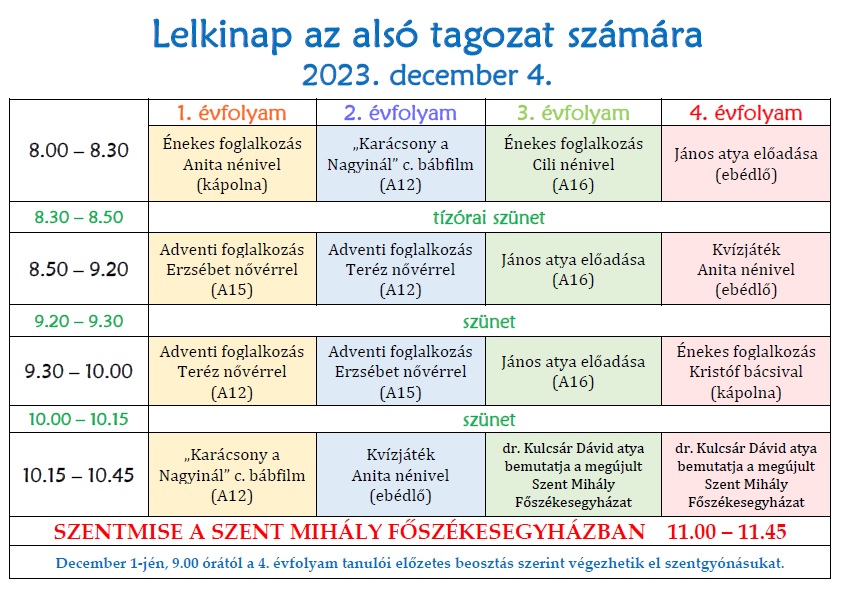 1-8. évfolyamokon az első 4 tanóra központi hittan/osztályfőnöki, utána ebéd a napköziseknek, felsős menzásoknak. Napközi 16:15-ig; részleteket az osztálytanítók adnak meg. Tanulószobai foglalkozás az 1. tanítási napon nem lesz.