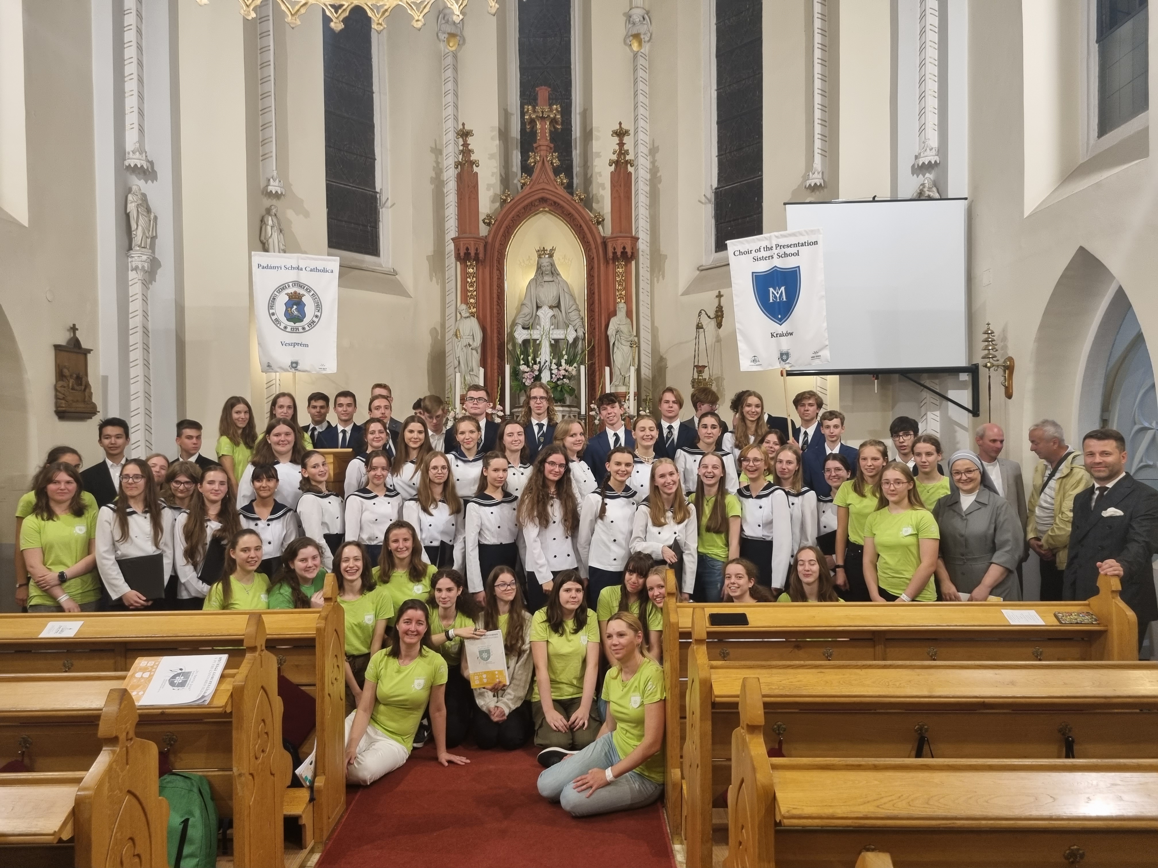 2023. szeptember 28 - és október 1 - között került megrendezésre egy nagyszabású nemzetközi kórusfesztivál a Pueri Cantores jegyében. Iskolánk énekkarai voltak házigazdái a rendezvénynek, így a 15 meghívott kórus bázisa volt az épület a hétvégén. A Krakkóri Prezentációs nővérek Iskolája is ellátogatott hozzánk, és újra fogadhattuk őket. A lengyel diákok családoknál szálltak meg, új barátságok kötődtek és felejthetetlen zenei élményekkel gazdagodtunk. A Padányi Schola Vegyeskar és a Padányi Gregorián kamarakórus karnagyai Zsilinszky Cecília és Hutvágner Erika a fesztivál főszervezői voltak. Kórusaink a székesfehérvári Vox Mirabilis Kamarakórussal a kiemelt kórusok közé tartoztak, akik a kórustalálkozó liturgikus és zenei programjain az éneket vezették. A mintegy 600 fiatal énekes október 29 - én pénteken este egy egész napos kóruspróba után a Mendelssohn Kamarazenekarral együtt adott gálahangversenyt. Szombaton délelőtt a Szent Imre szobor megkoszorúzása után zászlóval vonultak végig a főutcán egészen a Szentháromság térig. Dr. Udvardi György Érsek Atya nagy szeretettel fogadta az ifjúságot, majd a Szent Mihály Főszékesegyházban békeliturgián vettek részt. A békért fohászkodtak, és imádkoztak az Oltáriszentség előtt. Délután a szabadidő alatt bekapcsolódhattak a Kattárs programokba és ismerkedhettek városunkkal. Este Veszprémben és a vidéki településeken 11 helyszínen teljesítettek zenei szolgálatot és adtak bemutatkozó hangversenyt a kórusok. Ez volt a "kórusok éjszakája" program. Iskolánk a krakkói kórussal a Regina Mundi templomban lépett fel. Vasárnap a Duna televízió által is közvetített érseki ünnepi szabadtéri szentmisén újra együtt énekeltek mind a kórustalálkozó résztvevői. A három napos rendezvény során minden nap hallható volt, Balatoni Sándor In terra pax című kórusműve, amely erre az alkalomra pályázat útján íródott. Mindannyiunk számára nagyon sokat jelentett a rendezvény ideje alatt találkozni a Pueri Cantores Nemzetközi Kórusszövetség elnökségével, magyar zenei vezetőkkel, zeneszerzőkkel. Iskolánk énekkarosai is felejthetetlen zenei és közösségi élményekkel gazdagodtak. Méltán lehetünk rájuk büszkék, hogy ezen a nemzetközi szintű zenei rendezvényen örömmel, lelkesedéssel, és kitartó munkával álltak helyt. Köszönjük az iskola vezetőségének támogatását, a tanároknak és diákoknak a sok önkéntes segítő munkát.