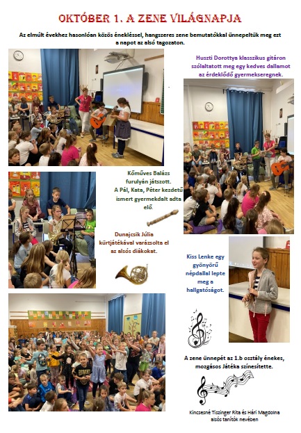 Az elmúlt évekhez hasonlóan közös énekléssel, hangszeres zene bemutatókkal ünnepeltük meg ezt a napot az alsó tagozaton.Tiszttartó Mária és Szalay Dóra 3.A osztályos tanulók furulyán adtak elő néhány gyermekdalt.Ivácson Márton 4.A osztályos diák J.S.Bach Parasztkantátáját szólaltatta meg a hegedűjén.A 4.B-s Gulyás Blanka és Eizenacker Míra zongorajátékkal lepte meg társait. A zene ünnepét a 3.B osztály énekes, mozgásos játéka színesítette.