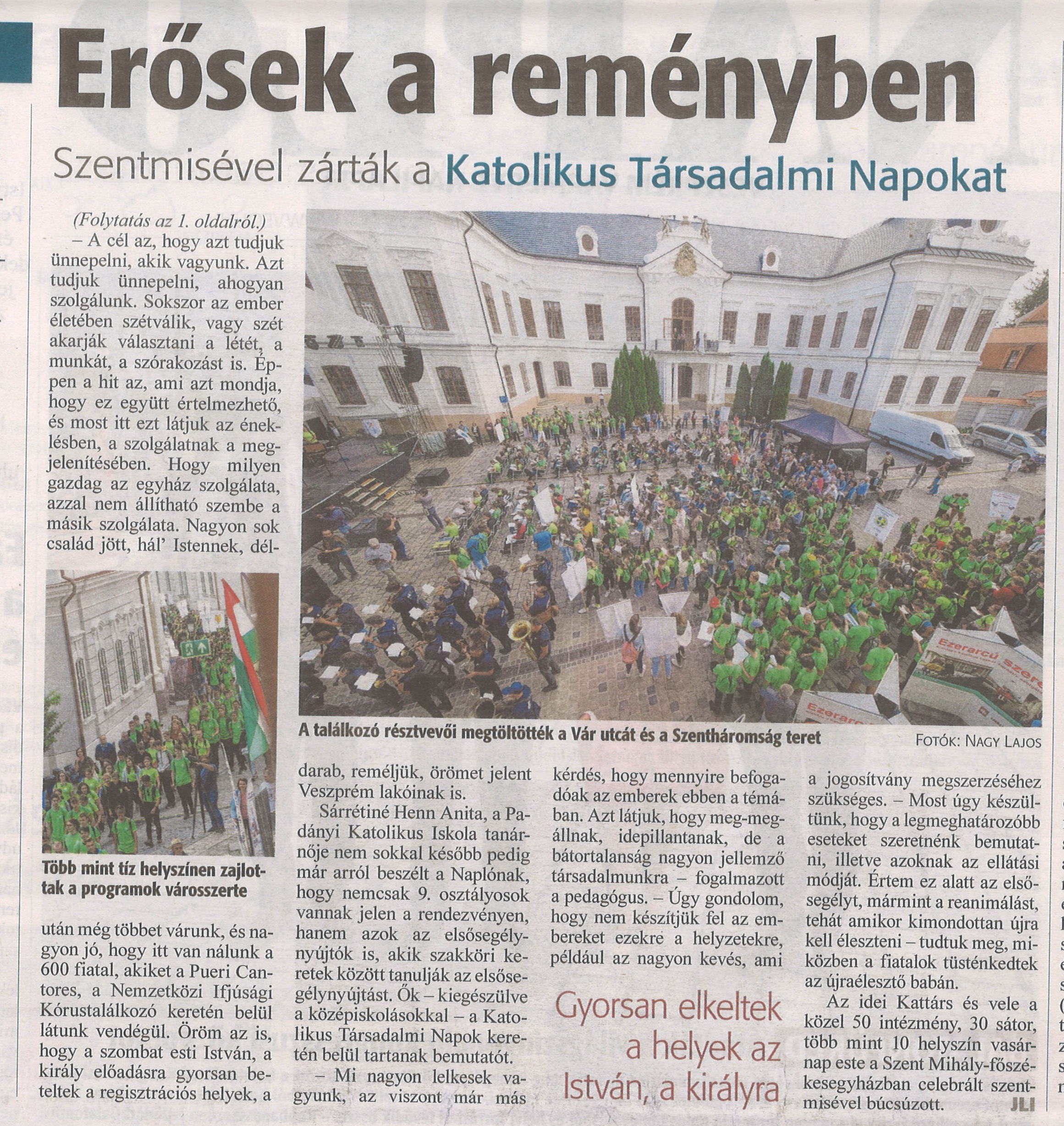 Július utolsó hetében Lengyelországba utaztak a Padányi Katolikus Iskola középiskolás énekkarosai a Pueri Cantores Ifjúsági Kórustalálkozóra. Az idei évben harmadik alkalommal vettek részt ezen a nagyszabású fesztiválon, amelyen 21 kórus és mintegy 800 énekes fiatal vett részt. Intézményünk krakkói testvériskolájának a Prezentációs nővérek gimnáziumának a meghívására tettek eleget nagy örömmel, hiszen az elmúlt két évben nem tudtak találkozni. A Pueri Cantores találkozók alapgondolata a békéért való imádság. Az idei fesztivál a békéért való könyörgés mellett a " Veni Sancte Spiritus" "Jöjj Szentlélek Úristen" jegyében zajlott. A liturgikus eseményeket zenei hangversenyek, kórus koncertek kísérték, így vált a vallási program egyben zenei kulturális élménnyé is. A Padányi Schola vegyeskar Zsilinszky Cecília vezetésével és a Padányi Gregorián Kamarakórus Hutvágner Erika vezetésével mutatkozott be nagy sikerrel ezen a nemzetközi eseményen. A diákok utazását a Veszprémi Érsekség és a Padányi Schola Alapítvány támogatta, melyet hálásan köszönünk.
