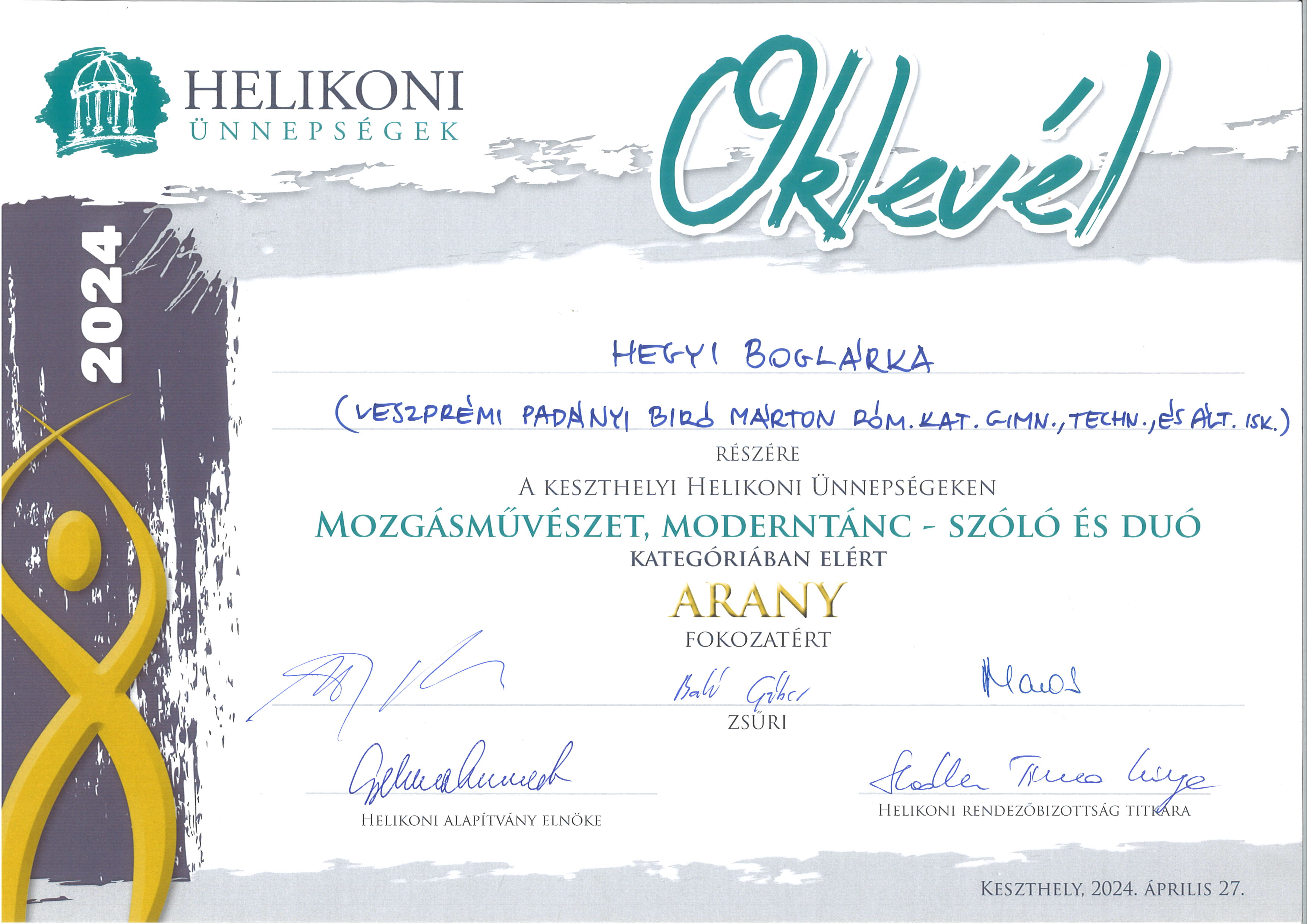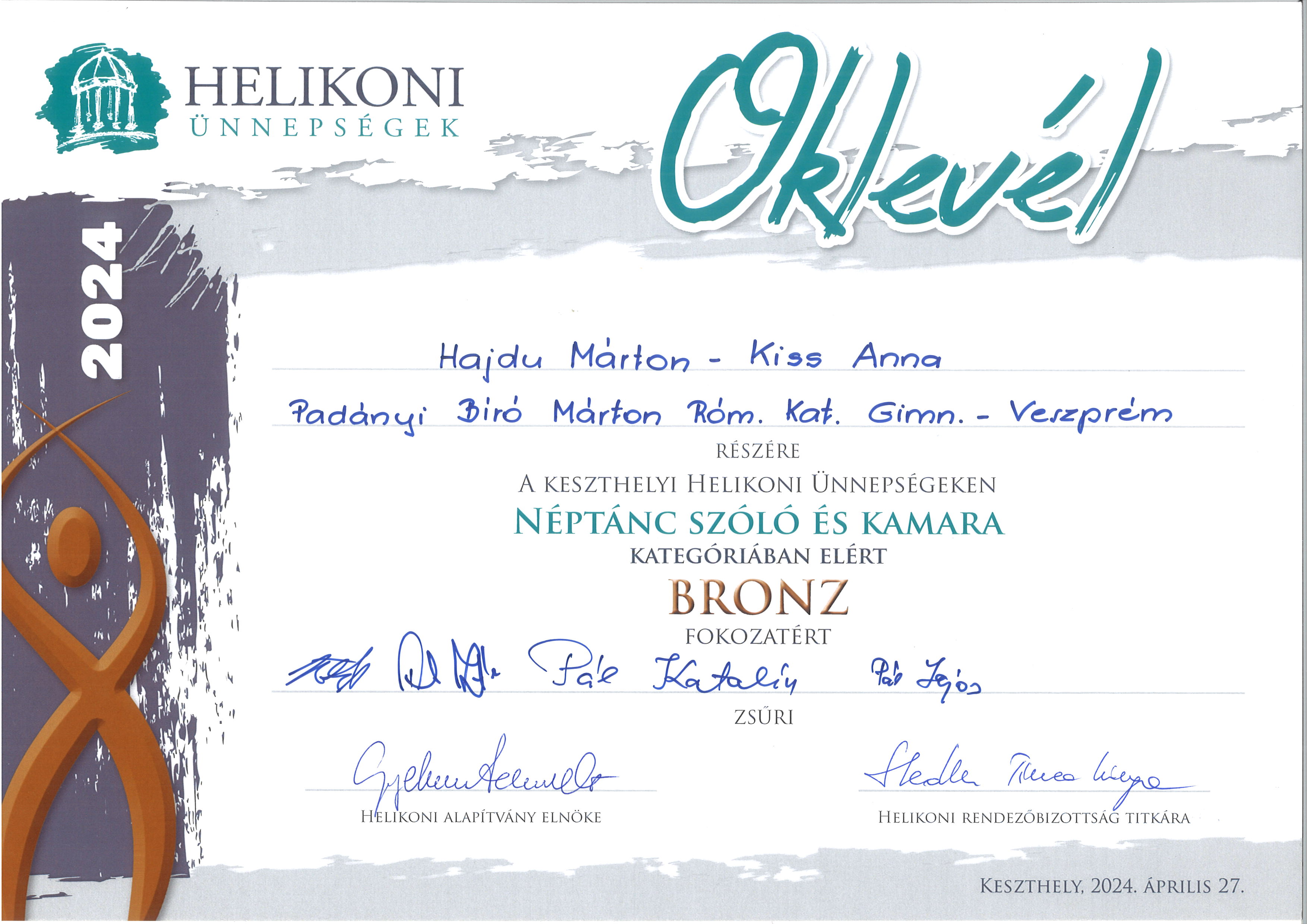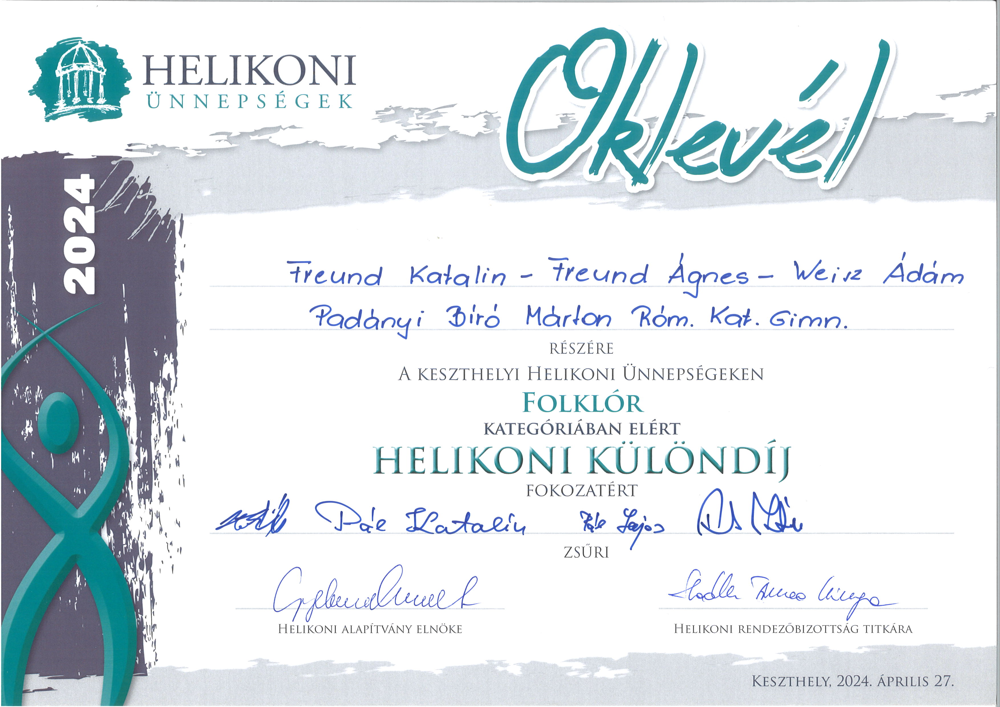 Pásztor Veronika 7.A osztályos tanuló a 2024.május 11-én, Budapesten megrendezett "Tiszán innen, Dunán túl" országos népdaléneklési minősítő verseny döntőjében Kiemelt ARANY minősítést kapott korcsoportjában újévköszöntő dalcsokrával. A Dúdoló Énekegyüttesben negyedmagával szintén Kiemelt ARANY minősítést kaptak, zalai népdalokkal. Felkészítetőjük: Baksa Kata,a Dúdoló Népzenei Műhely vezetője.