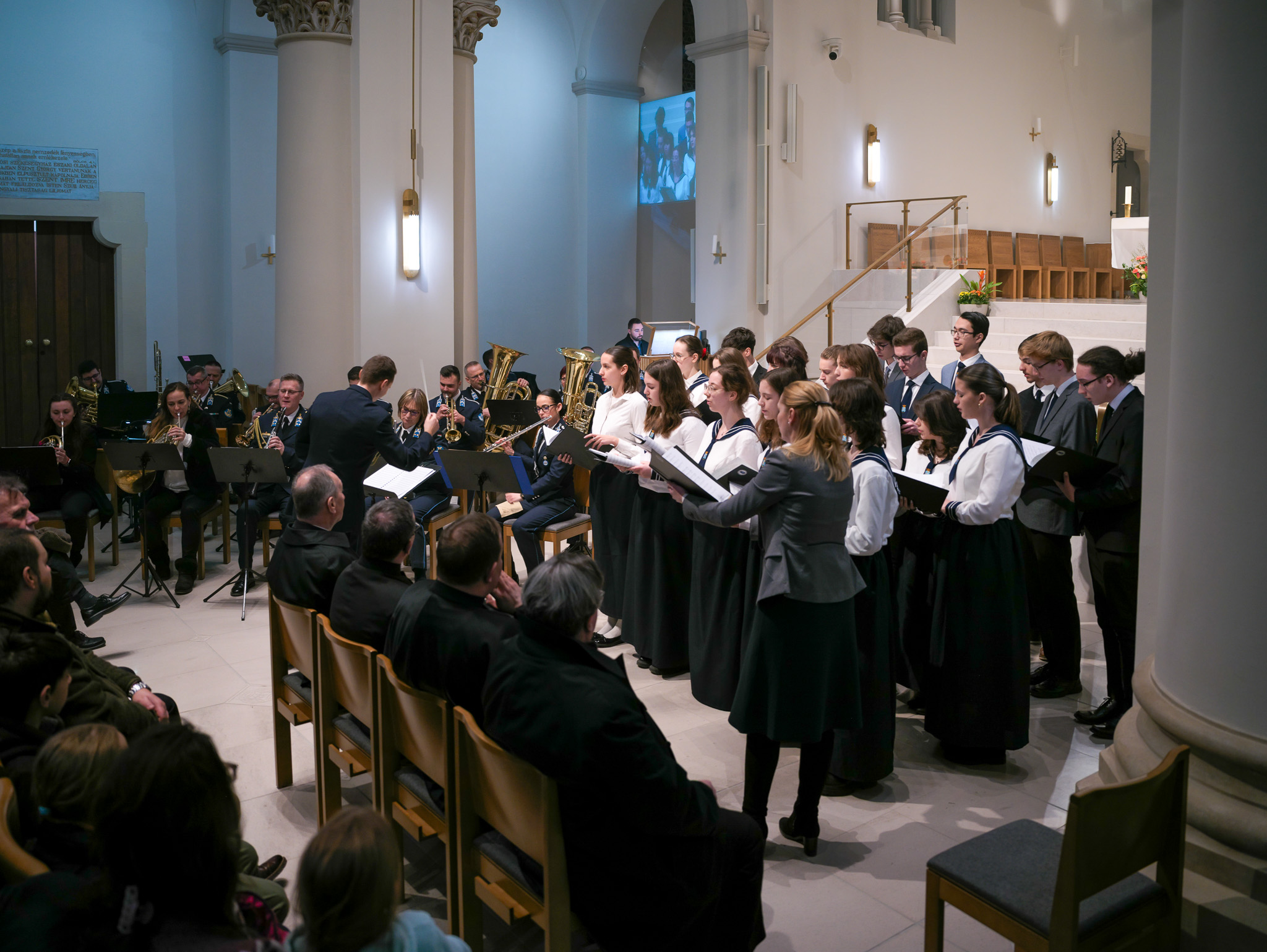 A Mindszenty 80 emlékévben február 22-én arra emlékeztünk, hogy a nyilas fogságban szenvedő Mindszenty József püspököt meglátogatta Boldog Apor Vilmos győri püspök.A megemlékezés napján Dr. Veress András győri püspök szentmisét mutatott be a Szent Mihály Főszékesegyházban. A szentmisét követően a MH Légierő Zenekar ünnepi hangversenyt adott. Erre a nagyon szép és jeles alkalomra hívták meg iskolánk énekkarát közreműködőnek. Különösen megtisztelő volt a felkérés, és nagyon nagy örömmel készültünk a bemutatóra. Zeitler Dénes karnagy kérésére egy angol zeneszerző Howard Goodall 23. zsoltárra írt feldolgozást tanultuk meg. "Az Úr az én pásztorom nincsen hiányom semmiben" Dankos Attila karnagy kíséretével bemutattunk egy Pachelbel kánon feldolgozást: "Christ be with my" - "Krisztus vélem, Krisztus bennem, Krisztus mögöttem, Krisztus előttem."Végül pedig Balatoni Sándor: "In terra pax" című kórusművét énekelhettük fúvószenekari kísérettel.Hatalmas öröm és nagyon különleges zenei élmény volt nagy zenekari kísérettel éneklni. Remélem még lesz alkalmunk együtt dolgozni ezekkel a fantasztikus zenészekkel. A kórust felkészítette és vezényelte: Zsilinszky Cecília